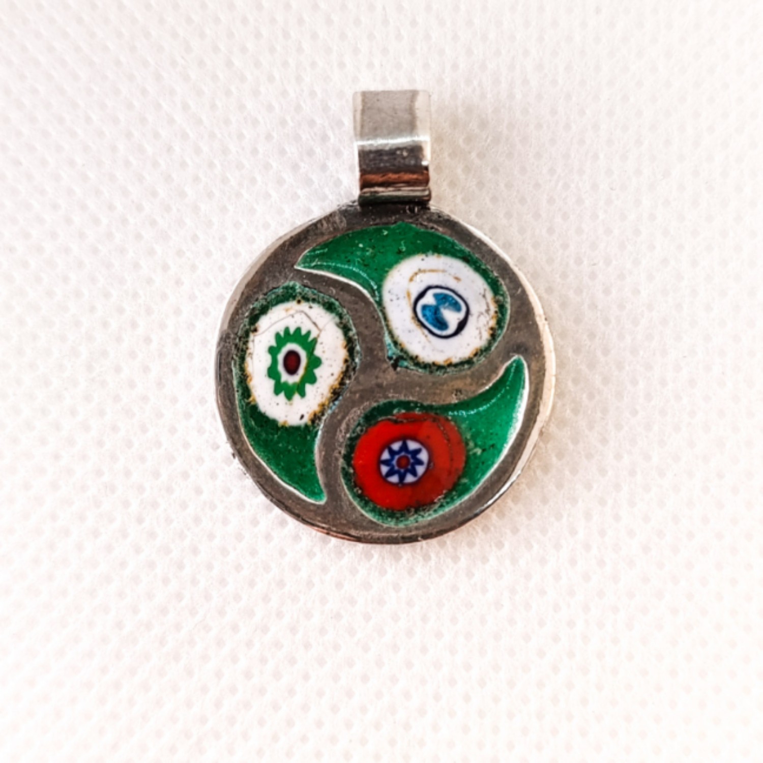 Triskel realizado en  plata Ley 950 a la cera perdida, una sola pieza maciza esmaltada en técnica de champlebé y millefiore. Pieza única.